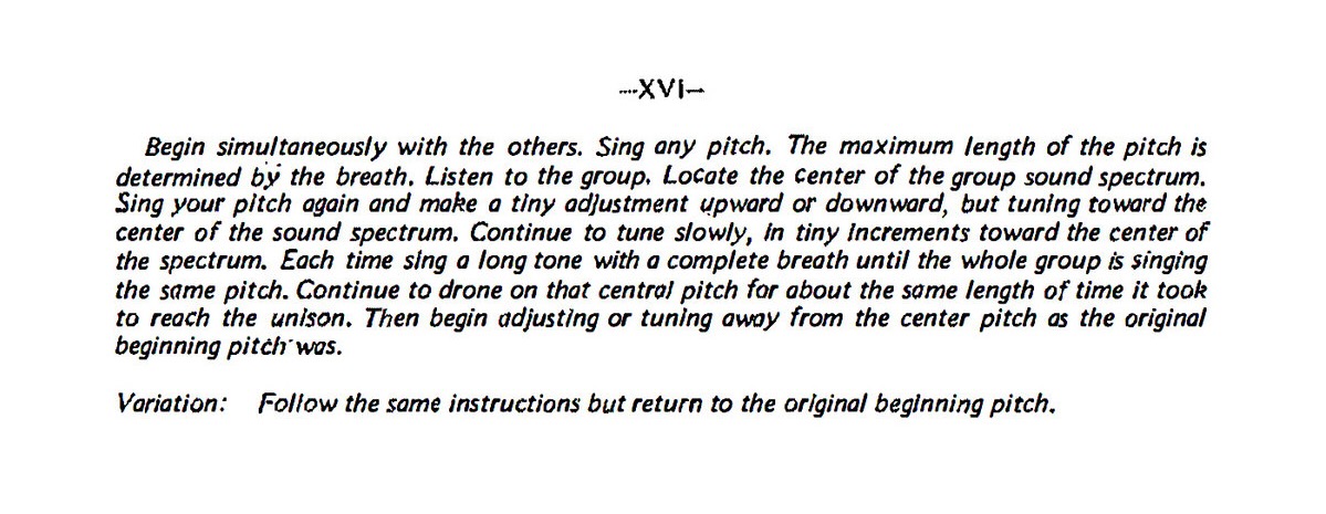 It began as Oliveros’ personal listening practice in the late 1960s, developed in response to the political and social climate of America at the time and therefore was aimed at reconnecting with oneself amidst the ongoing violence of the Vietnam war. Oliveros described listening as an active act, compared to hearing which is passive. The ultimate goal of her practice was learning to “listen to everything all the time” and remind herself when she wasn’t listening. The result of many years of practicing alone and in private groups was Sonic Meditations, a collection of listening exercises designed to heighten awareness of both the world and the social structures within it.